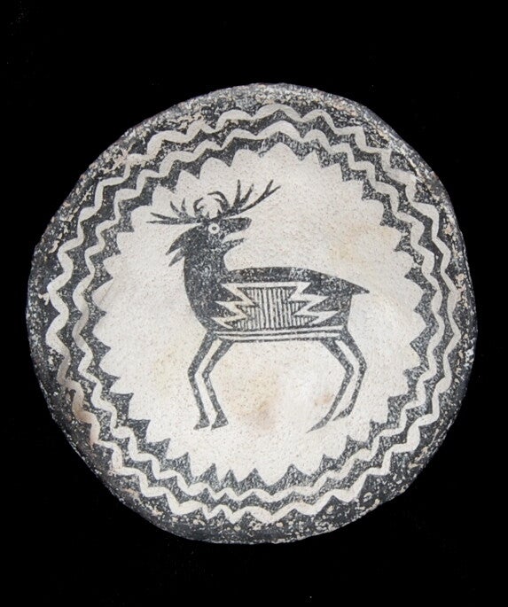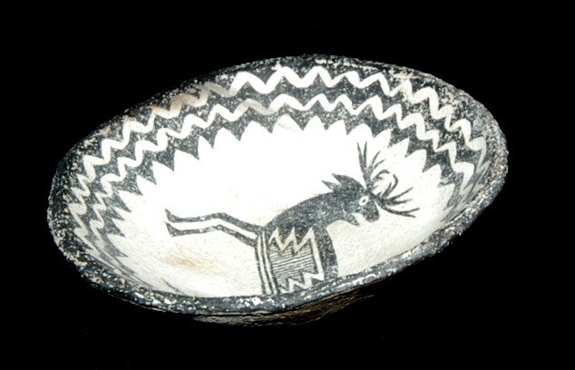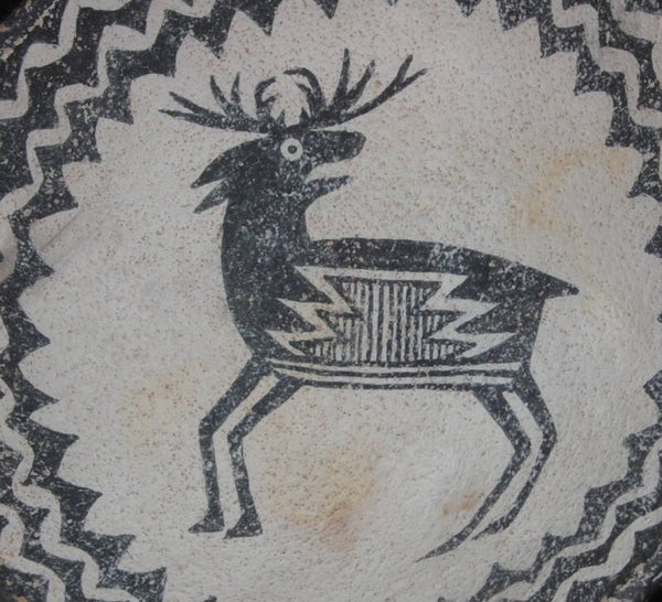 This bowl was handcrafted and painted to appear as an authentic Mimbres item in every way. The subject is of a startled deer that while fleeing, glances over its shoulder to get a better look at its pursuer. The prehistoric Mimbres tribe existed from approximately circa 200 to 1150 AD in the prehistoric southwestern deserts of America. Today they are best known for the fantastically painted ceramic bowls they left behind. Rich fire clouds adorn this bowl, and a soft smoky patina covers its surface. The vessel was hand formed and scraped prior to being painted with homemade brushes of hair and yucca. It was fired in an open wood fire pit. After the ashes cooled it emerged as a timeless piece of art that harkens one’s thoughts back to a simpler less complex time in the prehistory of man. An original Mimbres bowl is rarely seen today unless one travels to an antiquities museum or is fortunate enough to know a private collector who can afford such a wonderful piece of prehistoric art. This replication “Fleeing Deer Bowl” is not only affordable, but also an available option for one interested in the archeological arts. In the White Mountains of Arizona, we at Starling Black Studio, attempt to make each piece as realistic looking as possible. I’m sure you will enjoy this bowl as much as we were pleased to make it. Thank you for looking.