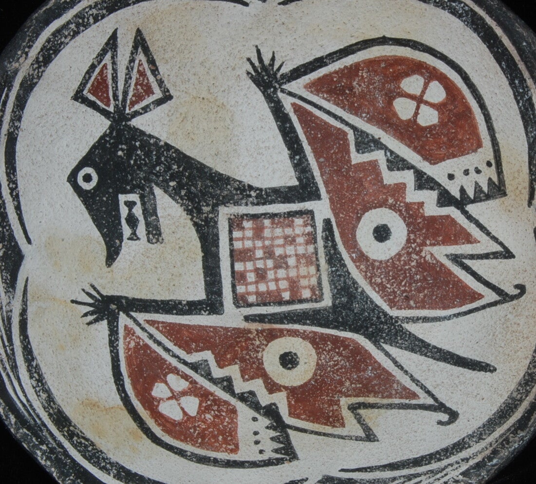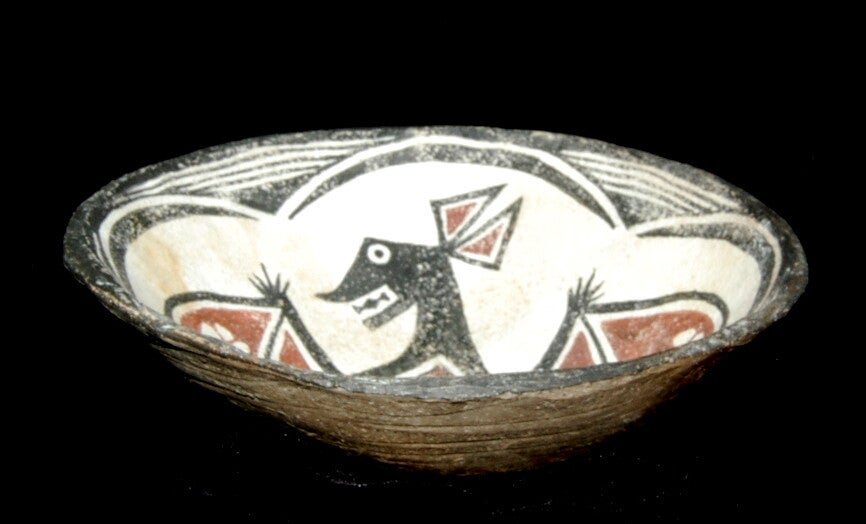 the now extinct Mimbres Culture is best known for the small to medium sized ceramic bowls upon which they painted the natural world that surrounded them. Starling Black Studio is committed to realistically recreating primitive arts from extinct cultures. Our pieces are constructed and processed using primitive and traditional techniques which render upon their surface a smoky patina that is rich with fire clouds. The bowls are purposely abraded, stressed, and stained to give the appearance of an authentic artifact. The bat, a common theme in the Mimbres Culture, with several different renditions unearthed. We are very fond of the bat motif and are happy to offer our fifth variation of it. If you appreciate the art from prehistoric cultures and have a love for archeology, then I believe you will be pleased with our inspired replication of “Polychrome Bat #5.” Thank you for looking.