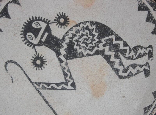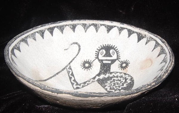 The Mimbres Culture was related to the Anasazi Tribe, although because of their geographic isolation Mimbres Art took a divergent tangent from the Anasazi. A legacy of small to medium sized ceramic bowls which depicted the natural world were left to us. This reproduction bowl is rendered with the image of what is believed to be a shaman painted upon its interior surface. Some believe this image is that of Kokopelli, but others disagree, because a staff replaces the flute identified with Kokopelli. Our best guess would only be riddled with speculation and conjecture as no written records were kept by this extinct tribe. Why they left and where they went is unknown. The Mimbres Culture spanned from circa 200 to 1150 A.D. where they resided in the southwest deserts of America. Starling Black Studio in the White Mountains of Arizona attempts to reproduce realistic looking replications of original artifacts. This vessel was inspired by Mimbres bowls viewed in books and museums. Our vessels are handmade and painted with homemade brushes of hair or yucca. A dirt pit firing of juniper wood renders rich fire clouds and a smoky patina upon each bowl's surface. If you enjoy the rawness of primitive art, then I believe you will not be disappointed in our work "Shaman Bowl." Thank you for looking.