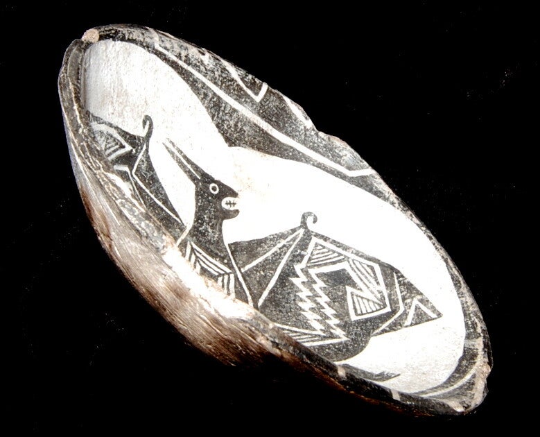 The now extinct Mimbres Culture (circa 200 to 1150 A.D.) is best known for the wonderful pictures they painted upon small to medium-sized ceramic bowls. A popular theme was that of the bat. Several different varieties and styles of this subject have been recovered form historical sites and ruins. This reproduction bowl is a copy of one of those renditions. This particular bowl was brought to our attention by a physician residing in New Mexico. At Starling Black Studio, we strive to make realistic replications of these bowls. The bowl was handmade using primitive techniques and wood firing to create a smoky patina upon the surface. A kill hole was shot through the center to affect another level of authenticity. Authentic bowls are few and extremely expensive if you indeed can find one for sale. Most of us must take a road trip to a distant archeological museum to even see these pieces of antiquity. If you love archeology and have an appreciation for the rawness of the primitive arts, then I believe you will not be disappointed with the acquisition of “Bat Bowl.” Thank you for looking.