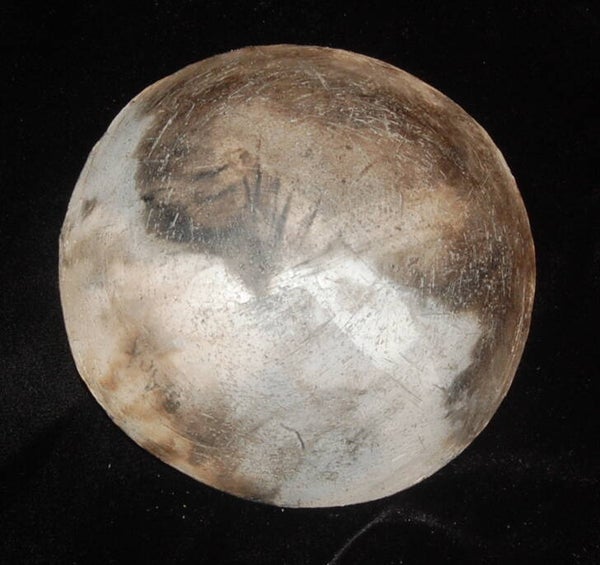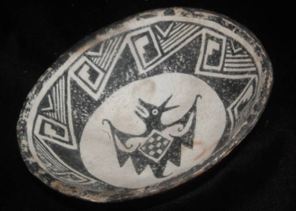 The now extinct Mimbres Culture (circa 200 to 1150 A.D.) is best known for the wonderful pictures they painted upon small to medium sized ceramic bowls. A popular theme was that of the bat. Several different varieties and styles of this subject have been recovered form historical sites and ruins. This reproduction bowl is a copy of one of those renditions. At Starling Black Studio, we strive to make realistic appearing replications of these bowls. This bowl was purposely cracked, chipped, and abraded. It was completed by shooting a kill hole in its center. The result is simply a fantastically authentic appearing replication. Authentic bowls are few and extremely expensive if you indeed can find one for sale. Most of us must take a road trip to a distant archeological museum to even see these pieces of antiquity. If you love archeology and have an appreciation for the rawness of the primitive arts, then I believe you will not be disappointed with the acquisition of one of our pieces. Thank you for looking.