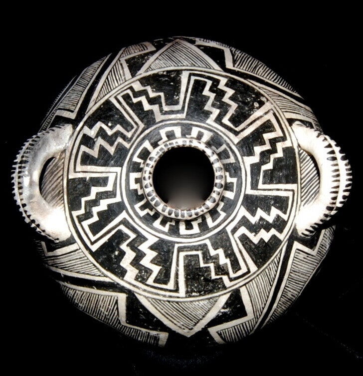 The Anasazi Culture was composed of Ancestral Puebloans who frequented the desert and high country of prehistoric Southwestern America. Their legacy was a plethora of stone pueblo structures and ceramic pottery sherds that ranged from New Mexico, Arizona, Colorado, to Utah. Still today, the countryside is scattered with black and white pottery sherds which speak to their prolific and artistic abilities. High in the White Mountains of Arizona, Starling Black Studio attempts to replicate the wonderful ceramic vessels once made by this extinct culture. Our pottery pieces are made to appear as actual artifacts. You will not find smooth surfaces or symmetrical forms; small scratches and excoriations abound. The jars are handmade and painted with our homemade brushes and our propriety paints. Each olla, canteen, or jar is fumed, stained, and abraded. All are wood fired in a dirt pit which renders the surface with rich fire clouds and a smoky patina that can only be obtained from the use of these primitive processing techniques. No two pieces are the same and none appear new or refined. If you love the raw and simple beauty of the prehistoric arts and have an appreciation for the archaic look of artifacts, then I believe you will not be disappointed with " Anasazi Swirl Canteen" as our work reflects the beautiful art and the spirit of the Anasazi.