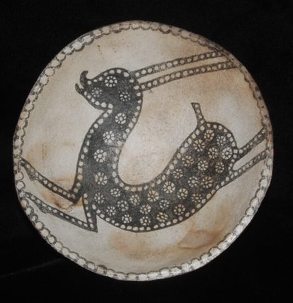 This is a replication of an ancient Persian bowl that depicts a highly decorated and stylized gazelle that appears to be flying across the vessel's surface. Indeed, the graceful animal is not only entering but appears to be leaving the bowl's surface all at the same moment. We use traditional processes and archaic techniques to create our replications. If you love archeology, anthropology, and have an appreciation for the raw beauty of the primitive arts, then I you will agree that "Flying Gazelle Vessel" is a fine rendition of the art once created from a distant time and place. Thank you for looking.