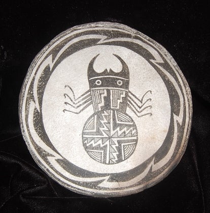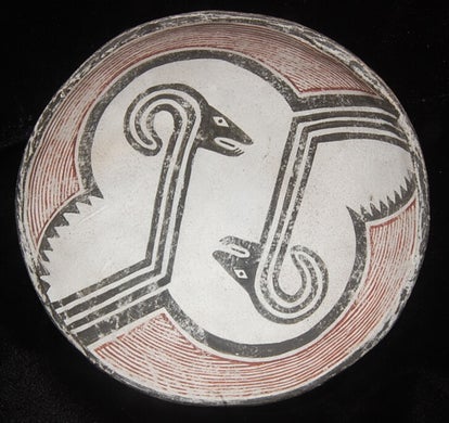 This is an interesting Mimbres (circa 200 to 1150 A.D.) bowl replication depicting a ritualistic sacrifice of a figure by a second figure who has donned a serpent headdress and wheels what appears to be a knife or possibly a hotdog with mustard on it. What we know of this culture is very limited as written or historical records are not available. The original bowl was unearthed on a private ranch in the Mimbres Valley of New Mexico and now resides at the University of Colorado Museum in Boulder.