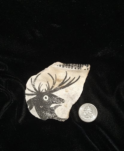 This piece was handcrafted, painted, and pit fired. It is rich with fire clouds and appears very authentic. The Frightened Deer Sherd is a great affordable alternative solution to the collection of authentic prehistoric artifacts which are rare, expensive, and at times of questionable origin. If you love the rawness and simplicity of prehistoric arts, then this piece will not disappoint you.